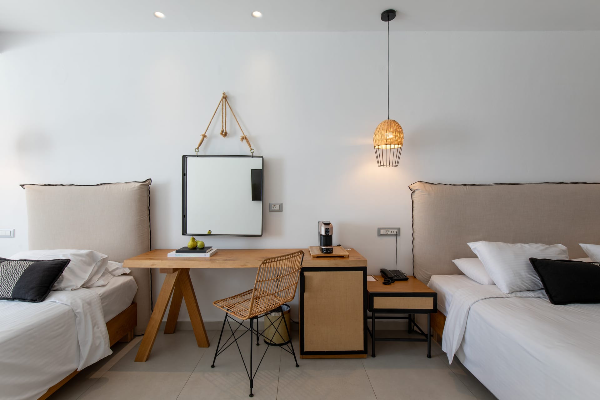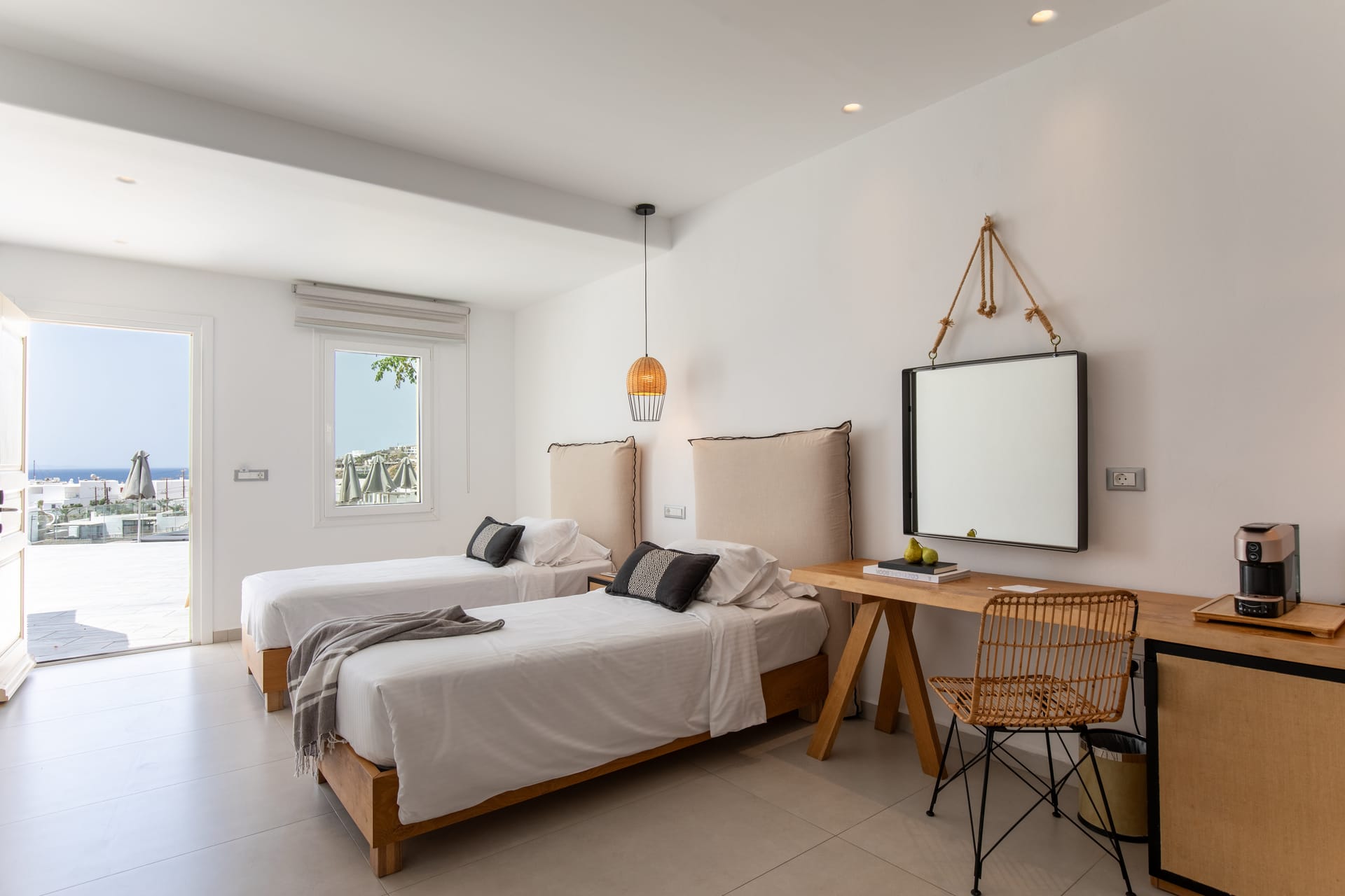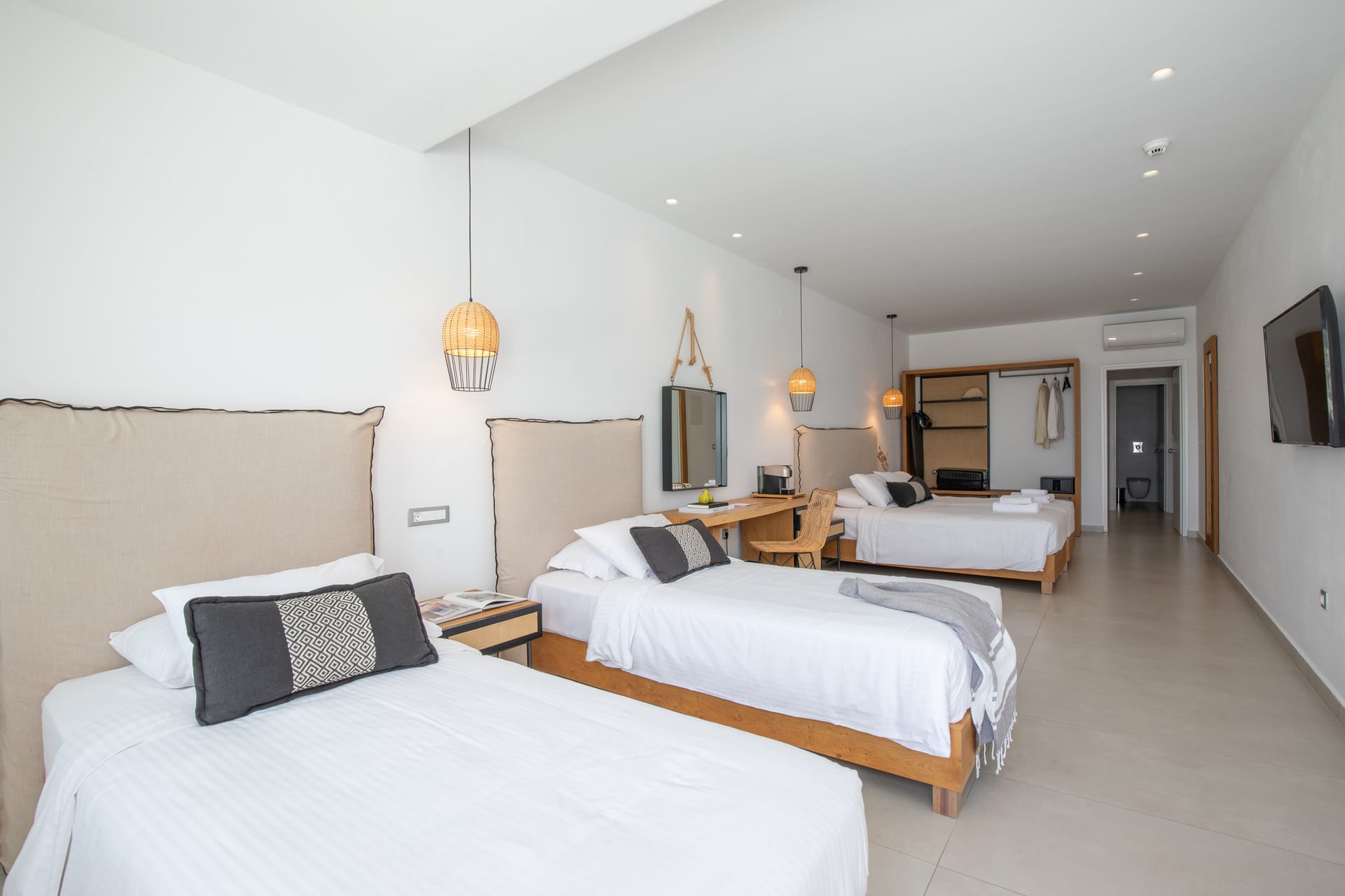 Luxury accommodation 38 m2, elegantly decorated , featuring a king-size and 2 twin beds or 4 twin beds, one bathroom with rainfall shower and a balcony with breathtaking views of the Aegean Sea. Ideal for 4 people. Located on the upper floor of the hotel above pool levels, sea view rooms offer balcony or terrace, equipped with seating area and easy access to the swimming pool.