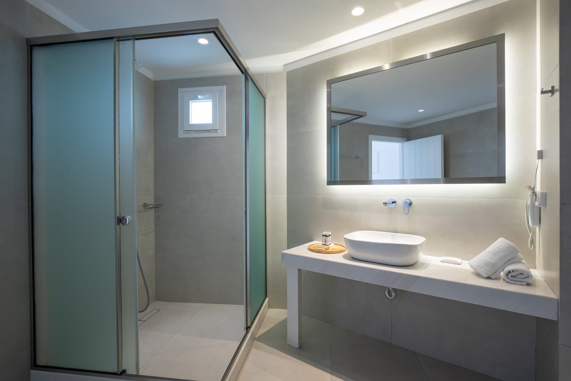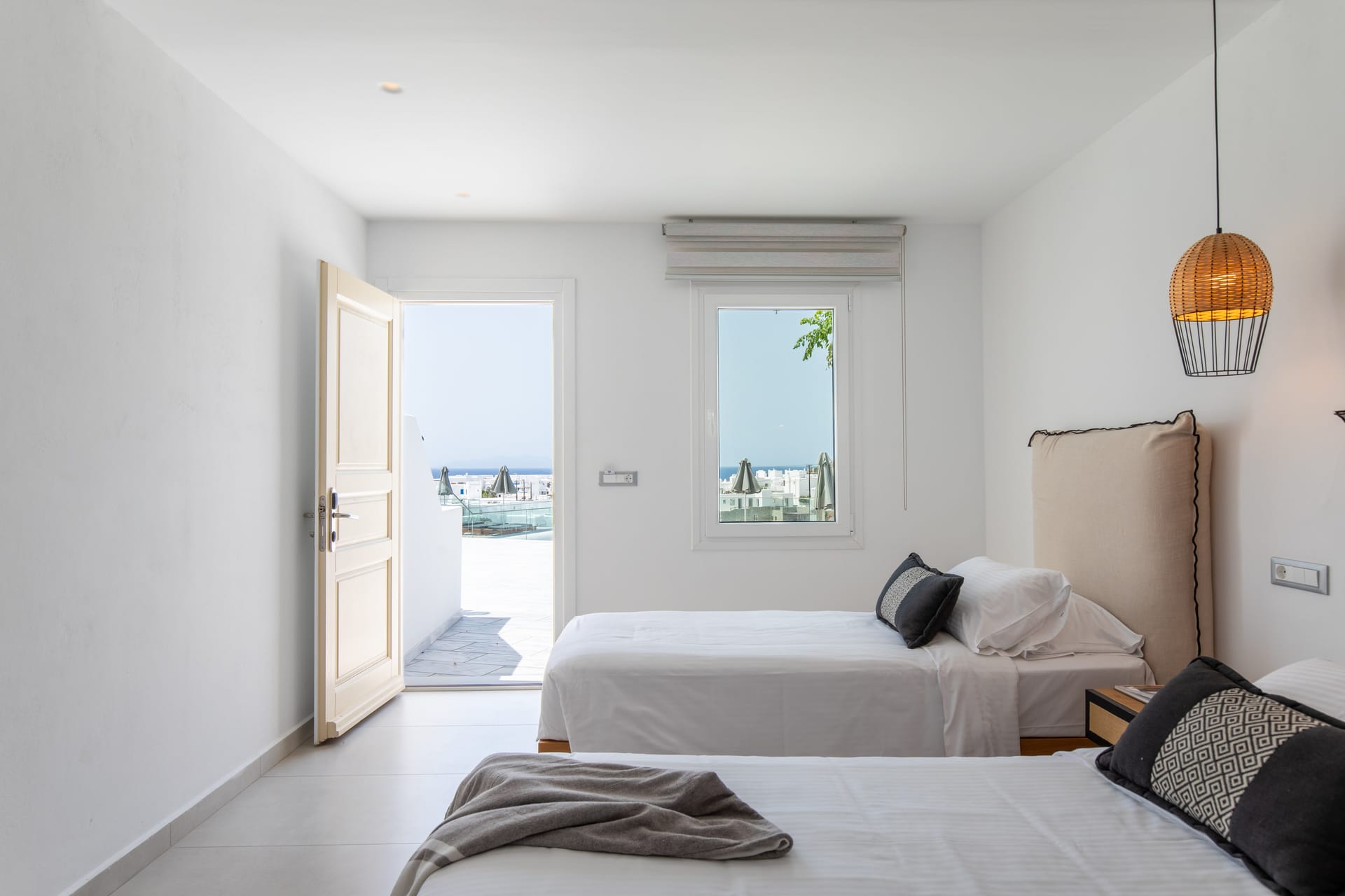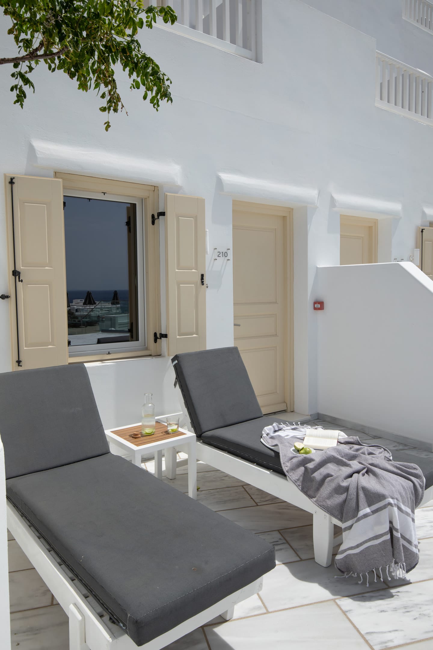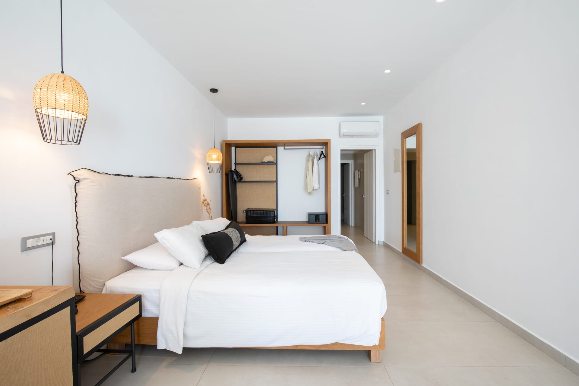 Luxury accommodation 38 m2, elegantly decorated , featuring a king-size and 2 twin beds or 4 twin beds, one bathroom with rainfall shower and a balcony with breathtaking views of the Aegean Sea. Ideal for 4 people. Located on the upper floor of the hotel above pool levels, sea view rooms offer balcony or terrace, equipped with seating area and easy access to the swimming pool.